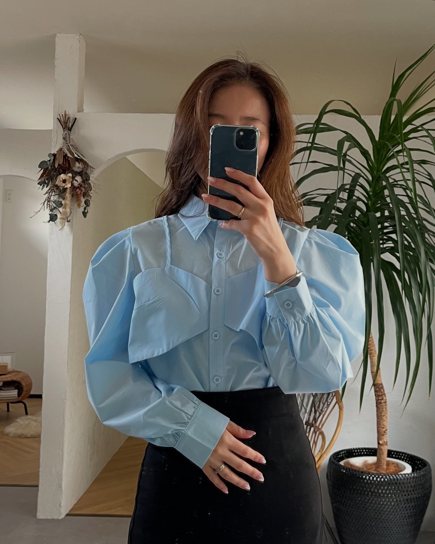 パフスリーブビスチェブラウス ビスチェデザインのパフスリーブブラウス ハリ感のあるキレイめ質感で様々なシーンで活躍できるデザインです。 【Size】 Free 【Color】 White Light blue White 着用 153cm Blue 着用 161cm