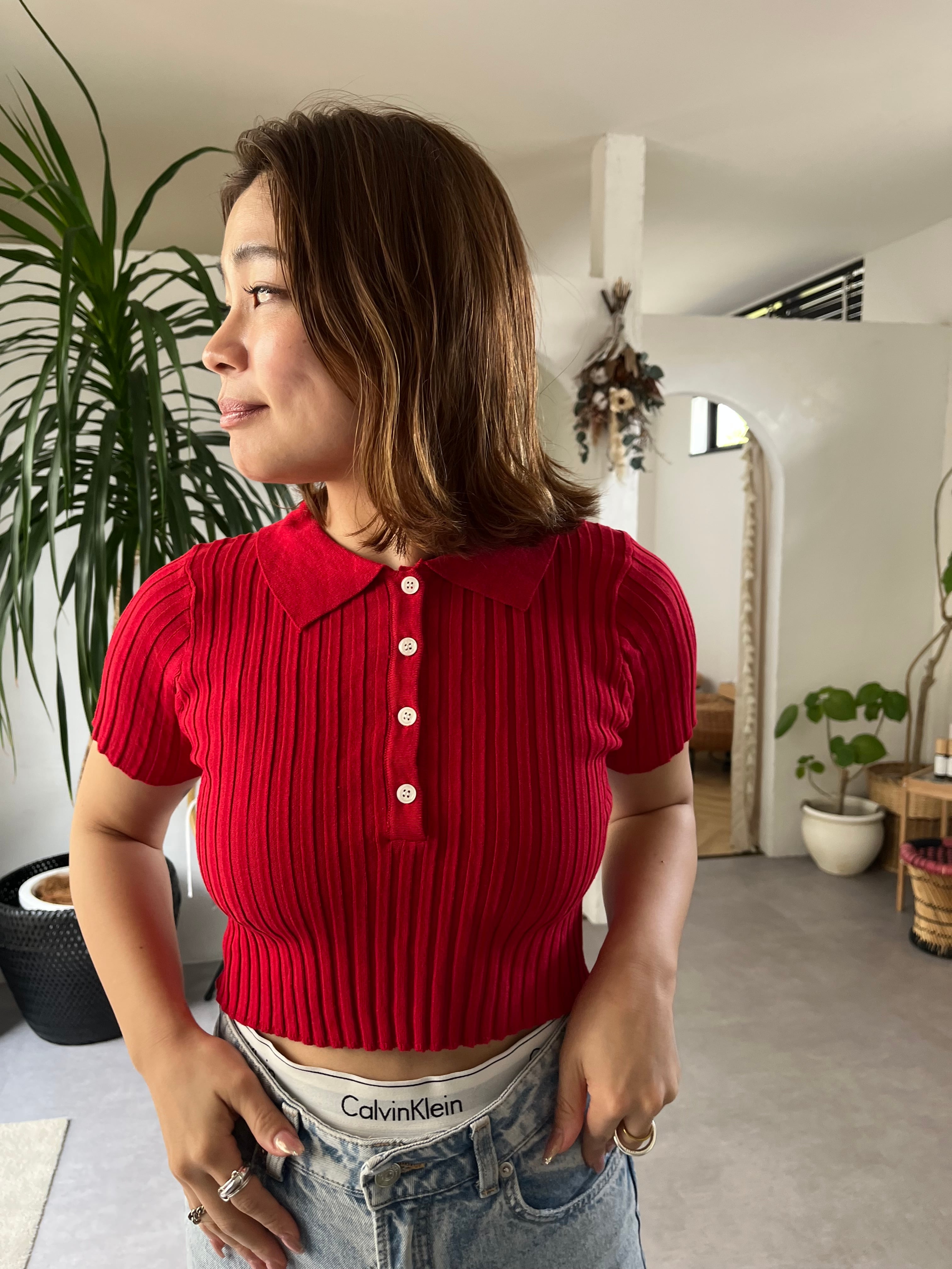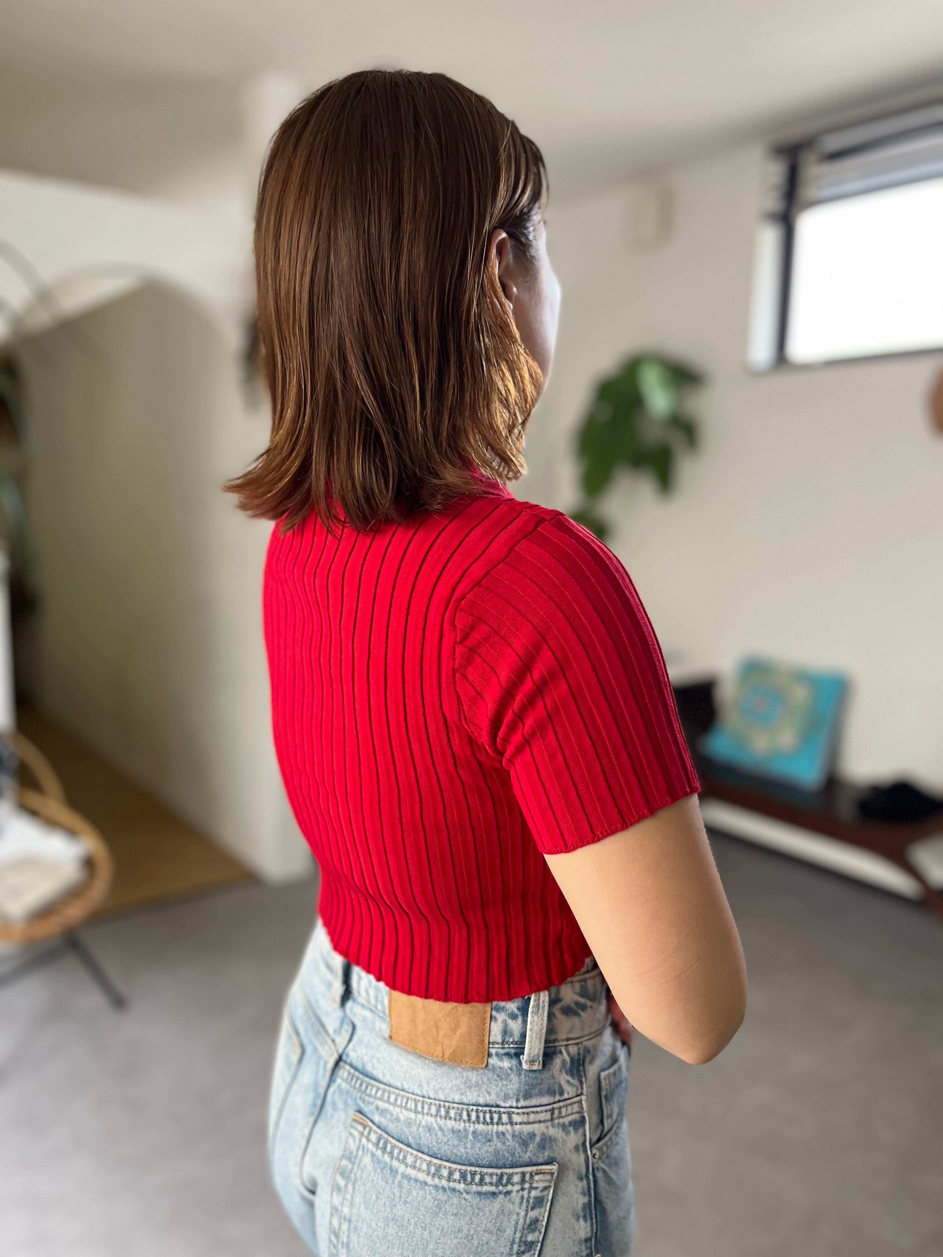 柔らかなリブ編み素材で、シンプルながらもスタイリッシュなデザインです。